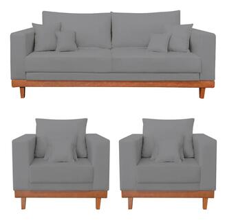 Kit 2 Poltronas Living + Sofá 2 Lugares Base Madeira Linho